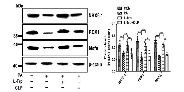 CLP-3094 (CLP; 0.7 μM; 48 h) inhibits the PA (palmitic acid) increased expression of PDX-1, NKX6.1, and MAFA in MIN6 cells. whereas L-Trp (0.7 mM; 48 h) causes an opposing effect.