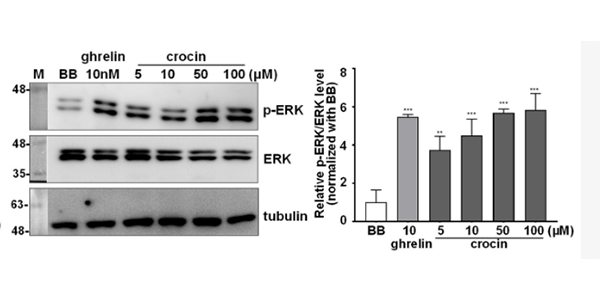Crocin (5, 10, 50,100 μM) significantly increases the level of ERK1/2 phosphorylation in GHSR1a-mCherry HEK293T cells.