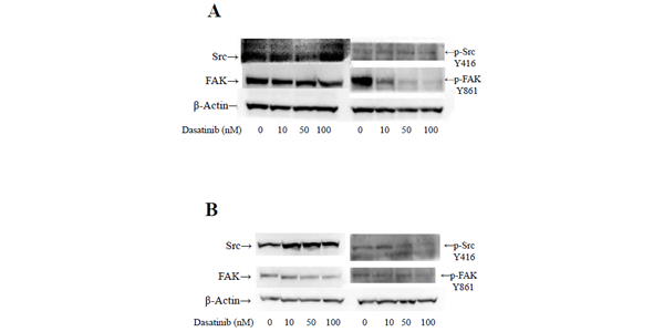 Western blot analysis of effects of Dasatinib (10 or 100nM) on c-Src, p-SrcY416, FAK and p-FAKY861 expression levels in KTC-1 cells and band intensities for p-SrcY416.