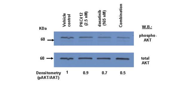 Drug combination effect on phosphorylation of AKT. Expression of phospho-AKT and total AKT in MOLM13 cells treated for 15 minutes with DMSO vehicle, PKC412 (2.5 nM), Dasatinib (165 nM), or a combination of both. Protein lysates are prepared from MOLM13 cells, and are analyzed via immunoblotting with antibodies to phospho-AKT and total AKT.