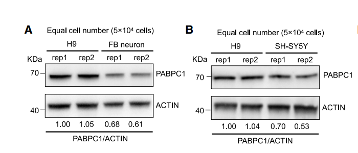 Expression of PABPC1 in H9 cells and FB neurons (A), H9 cells, and SH-SY5Y cells (B), revealed by western blotting. ACTIN was detected as control.