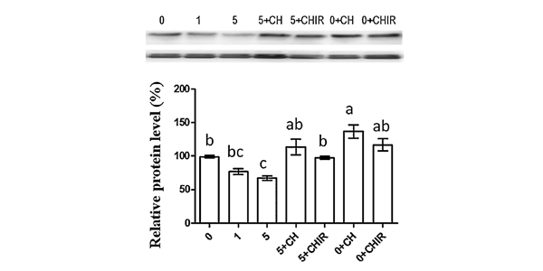Western analysis of β-catenin protein level in zebrafish embryos exposed to EOM in the presence or absence of CH/CHIR (n = 3). Different letters indicate significant differences. Moreover, both CH and CHIR attenuate the EOM-induced changes in the protein level of b-catenin and in EROD activity.