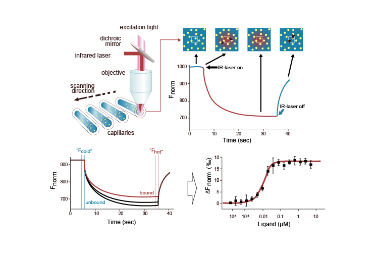 微量热泳动 (MicroScale Thermophoresis, MST) 是一种定量分析生物分子间相互作用的技术。MST 通过检测在温度梯度场中荧光标记生物分子泳动速率的差异,获取分子间的相互作用信息,广泛应用于结构生物学、分子生物学、生物化学、医学等基础科研领域, 特别在针对重大疾病研究的小分子活性药物和生物药物的开发领域发挥着重要作用。通过MST 技术检测分子互作时,样品无需固定在芯片或者传感器上,仅需要进行荧光标记,且 MST 技术对样品缓冲液要求不高,可用于复杂体系的检测。