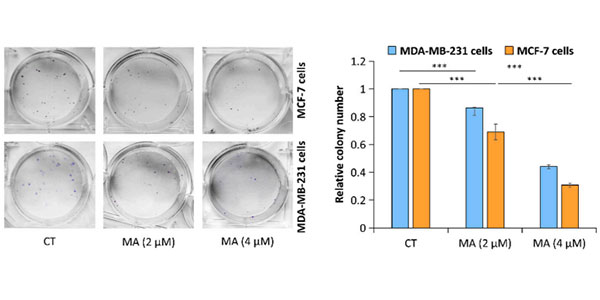 Manzamine A (MA) shows a long-term ability to inhibit both MCF-7 and MDA-MB-231 cells growth. The MA (0, 2, 4 μM; 24 h)-treated cells are seeded in 6-well plates and then cultured for 2 weeks.