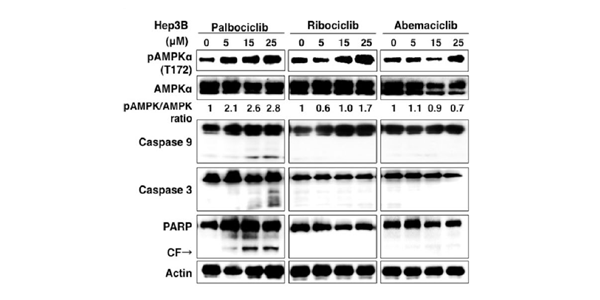 Effects of CDK4/6 inhibitors on AMPK phosphorylation and apoptosis-related signals. After 24 h of drug treatment, the cells are subjected to western blot analysis. AMPK phosphorylation level is quantified by the ratio of band intensities of phospho-AMPKα vs. AMPKα.