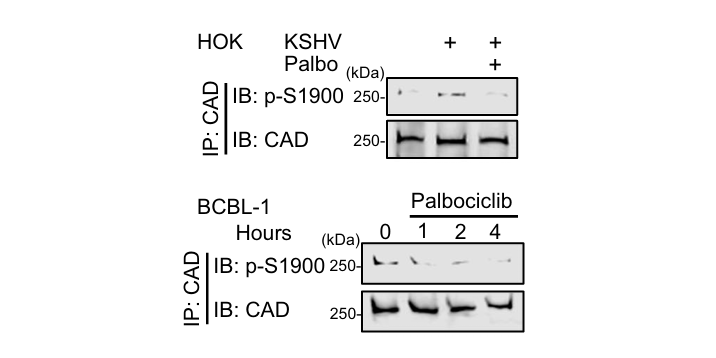 Palbociclib (50 nM; 4 h) effectively blocks S1900 phosphorylation of CAD in both KSHV de novo-infected human oral keratinocytes (HOKs) and KSHV-positive BCBL-1 lymphoma cells.