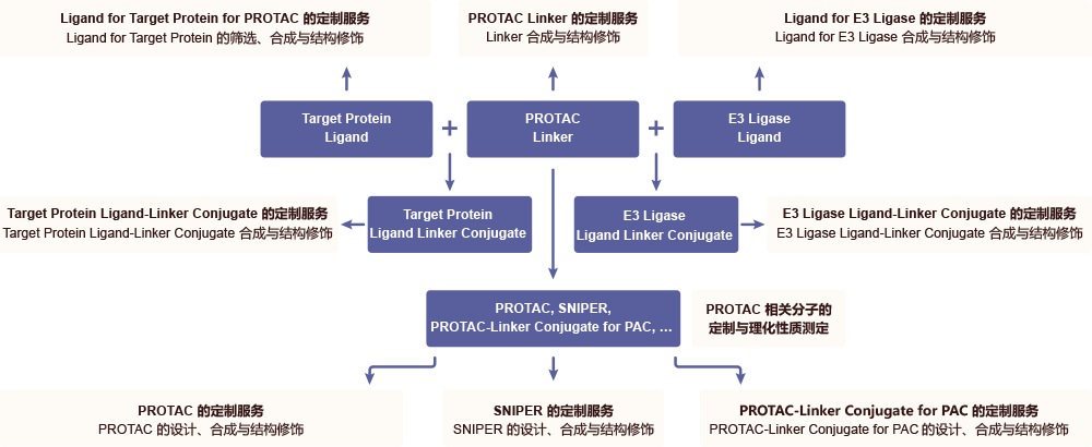 MCE 能够提供 PROTAC 相关产品 (Ligand for E3 Ligase、PROTAC Linker、Ligand for Target Protein for PROTAC、E3 Ligase Ligand-Linker Conjugate、Target Protein Ligand-Linker Conjugate、PROTAC、SNIPER、PROTAC-Linker Conjugate for PAC) 的设计、合成、分析、纯化、优化、检测和评估等一站式服务。