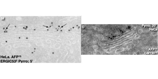 In HeLa cells transfected with AFP, pyrrophenone inhibits the delivery of AFP at the trans-side of the GC (Figure M-O).