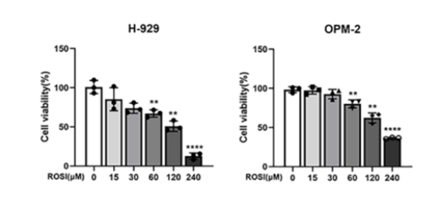 Rosiglitazone (ROSI; 15, 30, 60, 120, 240 µM; 24 h) significantly inhibits the growth of NCI-H929 and OPM-2 cells.