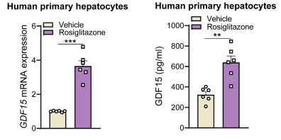 Relative GDF15 mRNA expression and GDF15 release in human primary hepatocytes treated with 10 μM rosiglitazone for 48 h.