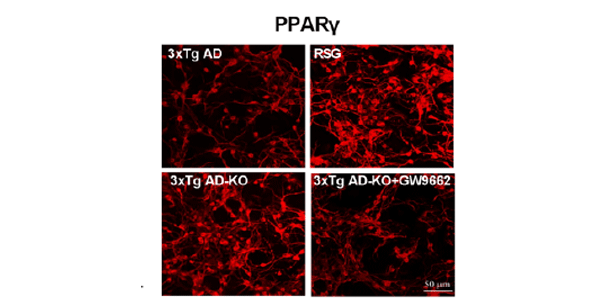 PPARγ level is determined by IF assay in 3×Tg-AD mice, 3×Tg-AD mice with RSG treatment, 3×Tg-AD-KO mice, 3×Tg-AD-KO mice with GW9662 stimulation.