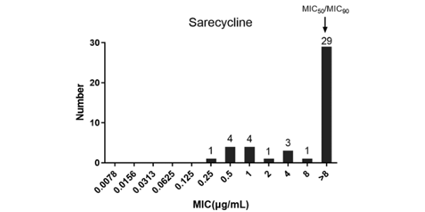 Sarecycline 抑制 55 株临床分离的痤疮棒状杆菌,其 MIC 值为 0.5~16 µg/ml; MIC50 为 0.5 µg/ml, MIC90 为 4µg/ml[1]
