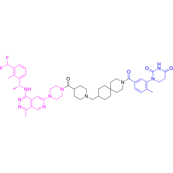 pan-KRAS degrader 4 (compound 69) 是基于 cereblon 的 PROTAC KRAS 降解剂,DC50 值小于 100 nM,具有抗癌活性。(粉色:靶蛋白配体 (HY-168671);黑色:连接子 (HY-168670);蓝色:E3 连接酶配体 (HY-W733895))。