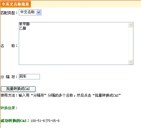使用方法:输入用“分隔符”分隔的多个名称,然后点击“批量转换成CAS”示例一示例二