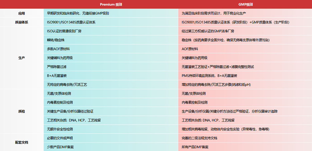ACROBiosystems致力于支持细胞与基因治疗药物(CGT)的相关研究,特在GMP级质量管理体系下,开发了一系列GMP级别细胞因子、细胞激活用抗体\磁珠、全能核酸酶、Cas酶等原料,适用于CGT药物的规模化生产和临床研究。同时,我们还提供可用于临床前研究的Premium级别原料,与GMP级别产品具有相同的性能,可实现从临床前开发到临床阶段的无缝过渡,为您的早期开发阶段提供了一种具有成本效益的级别选择。