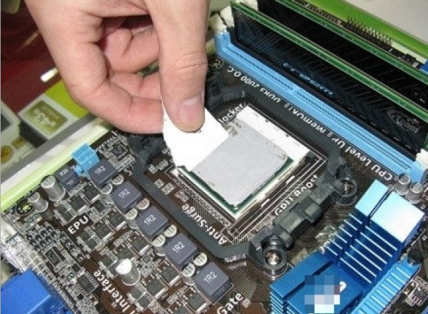 3、摊开策孙友律均匀后,隐约可见cpu金属外壳在薄薄的一层硅脂下面,用棉签或另一片干净的衡汪雀纸板或塑料片刮掉cpu外壳边缘溢出的硅脂。清洁完毕,如下图: