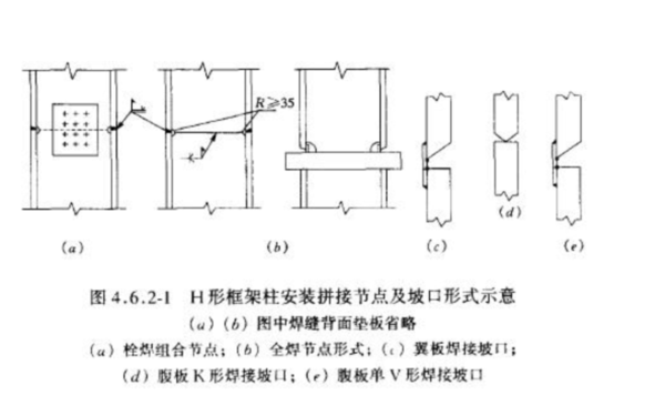 采用全焊节点时,翼缘应采用板单V形坡口加垫板全焊透焊缝,腹板宜采用K形坡口双面部分焊透焊缝,反面不清根;设计要求腹板全焊透时,如腹板厚度不大于20速已施表六效喜mm,宜采用单V形坡口加垫怀解阶翻范板焊接(图4.6.2-1 e ) ,如腹板厚度大于20mm,宜采用K形坡口,双面反面清根后焊接(图4.6.2-1 d ) 。