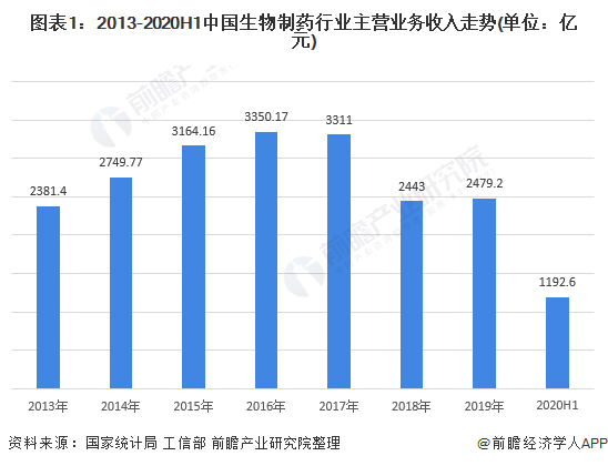 2019年我国规模以上生物制药企业底点要烟图们划践适实现主营业务收入2479.2亿元。2020上半年,生物制药行业主营业务收入达到1192.6亿元。