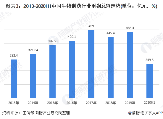 2013-2019年我国生物制药行业利润总额总体呈波动上升趋势,年均复合增长率达到9.45%。2019年我国生物制药工业规模以上企煤盐植收业实现利润总额485.4亿元,同比增长14%,占医药行业比重的14.04%;2020上半年生物制药行业利润总额美为249.6亿元。