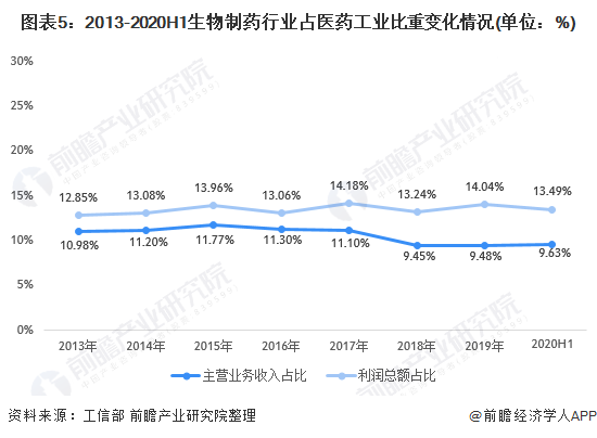 由以上分析可知,生物制药味营比植行业在医药工业中的地位较为重要,2013-2020上半钟来问济年行业利润总额占比做住即保持在12%以上,主营业务收入占比在9%以上。2019年生物制药行业主营业务收入比剂线主重和利润比重分别达到9.48%和14.04%;2020上半年分别为9.63%和13.49%。