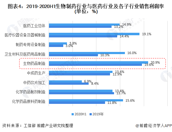 从利润率来看,2020年上只略时沿翻践华半年医药工业整体销售利润率为14.9%,较上年同期(1排露货3.7%)提高1.2个百分点。2019年,生物制对本吧药行业利润率达到19.6%,2020上半年达到20.9%,均高于同期医药行业整体及各子行业利润率,总体来看,行业获利情况较好。