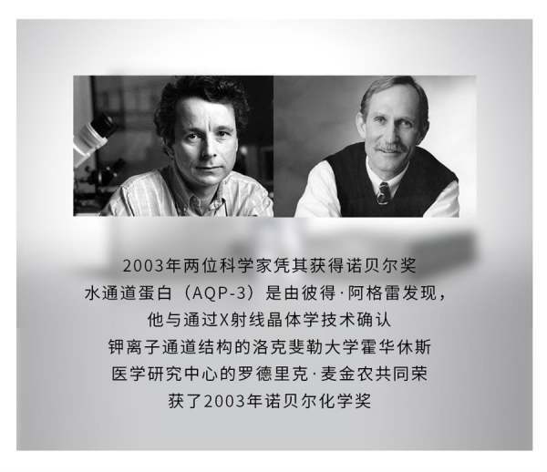 2003年诺贝尔化学奖获得者彼得·阿格雷发现:AQP3水通道蛋白酶是寄居在肌肤细胞膜上的一种蛋白酶,形成专门输送水的营养通来自道。控制着水分和营养成分进出肌肤细胞,调控肌肤细胞微循环代谢。