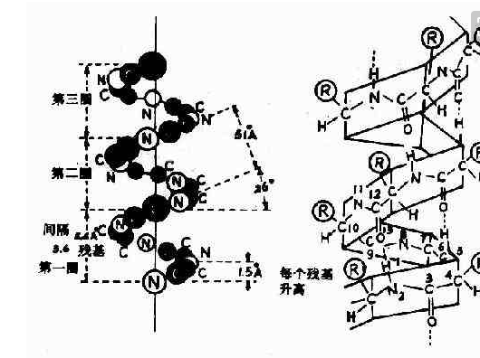 多肽链主链绕中心轴旋转,形成棒状螺旋结构,每个螺旋含有3.6个氨基酸残基,螺距为0.54nm,氨基酸之间的轴心距为0.15nm。