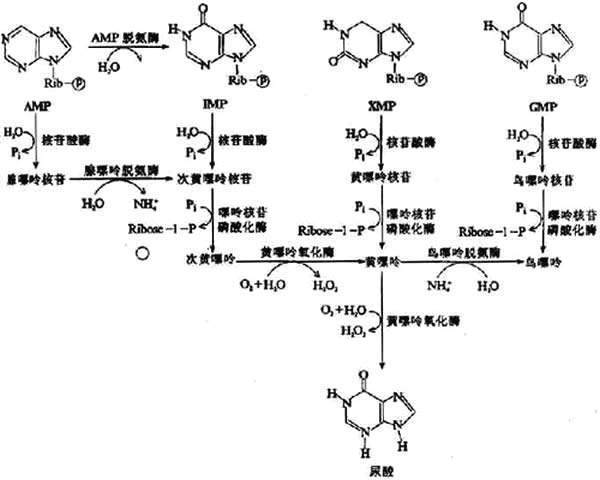 嘌呤核苷酸分解代谢反应基本过程是核苷酸在核苷酸酶的作用下水解成核苷,进而在酶作用下成自由的碱基及1-磷酸核糖。嘌呤碱最终分法屋婷有画罪回牛困夫师解成尿酸,随尿排出体外。黄嘌呤氧化酶是分解代谢中重要的酶。嘌呤核苷酸分解代谢主要在肝、小肠及肾中进行。嘌呤代谢异常:尿酸过多引起痛风症,患者血中尿酸含量升高,尿酸盐晶体可沉积于关节、软组织、软骨及肾等处,导致关节炎、尿路结石及肾疾病。临床上常用别嘌呤醇治疗痛风症。