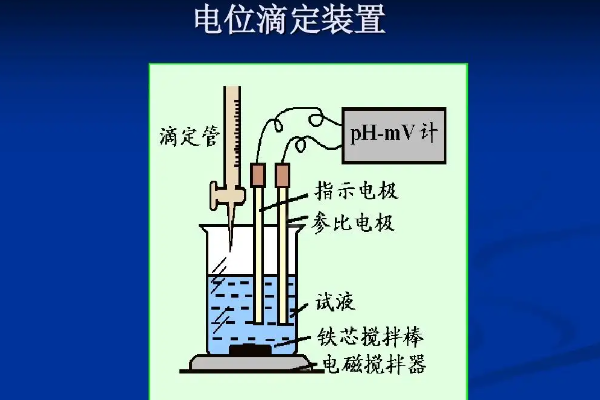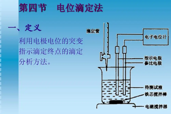 电位滴定法(potent来自iometric titration)是在滴定过程中通过测量电位变化以确定滴定终点的方法,和直接电位法相比,电位滴定法不需要准确的测量电极电位值,因此,温度、液体接界电位的影响并不重要,其准确度优于直接电位法。