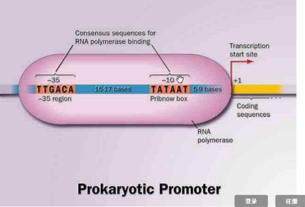 在真核生物基因中,Hogness等先在珠蛋白基因中发现了类似Pribrow区的Hogness区(Hogness box),这是位于转录起始点上游-25~-30 bp处的共同序列似TAAA,也称为TATA区。另外,在起始位点上游-70~-78 bp处还育另一段共同序列CCAAT,这是与原核生物中-35bp区相对应的序列.称为CAAT区(CAAT box)。 提纯被保护的片段后却发现,RNA聚合酶并不能重新结合或并不能选择正确的起始点,表明在保护区外可能还存在与RNA聚合酶对启动子的识别有关的序列。果然,科学家不久就从噬菌体的左、右启动子PL及PR和SY40启动子的-35 bp附近找到了另一段共同序列:TTGACA。经过数年的努力,分析了46个大肠杆菌启动子的序列以后.确证绝大虚咐部分启动子都存在这两段共同序列,即位于-10bp处(……T89A89T50A65A100……)的TATA区和-35 bp处(……T85T83G81A61C69A52……)的TTGACA区。现已查明,-10位的TATA区和-35位的TTGACA区是RNA聚合酶与启动子的结合位点,能与σ因子相互识别而具有很高的亲和力。