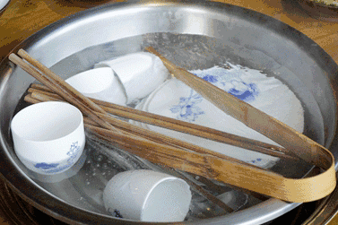 操作方法:在高压锅中加入清水,将已清洗干净的餐具一并放入;通电直至氏明码高压锅上气后再煮15分钟以上即可。
