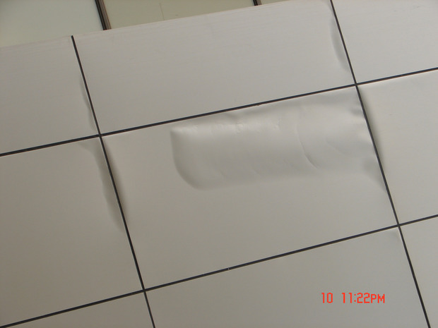 铝塑板板面有拇指印大小的塌陷,这一问题是高分子膜僵结所致。高分子膜的僵结大小不等,一般有大米粒大小,呈白色,属胶层质量问题。这些突出的粒状物在复合时,其周围的空气如同上述鼓泡现象一样不能被完全挤出,被裹入板中,当僵结加热溶化后随能与板层粘结,但有空气层阻隔的地方加倍直接受到影响,形成陷斑。需要从物资采购与生产管理上杜绝这一材料的质量问题。