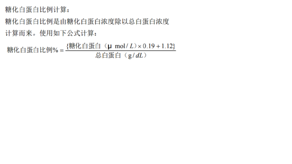 这是糖化白来自蛋橡滚袭白的计算公式,算式左边为糖化白蛋白占总蛋白百分比,右边分子是糖化白蛋白微摩尔浓度乘以2.3加上11.2,分母是总蛋白(克每升),下面附备斗上我公梁兄司注册产品GA说明书公式截图。