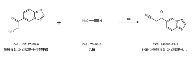 1.通过咪唑并[1,2-a]吡啶-6-甲酸甲酯和乙腈合成b-氧代-咪唑并[1,2-a]吡啶-6-丙腈,收率约38%;