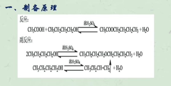 在250刚前握甚行云定mL的三口烧瓶上,中口装上分水器,分水器上口装上回流冷凝管,三口瓶一侧口装上200℃温度计。在三口瓶中加入冰乙酸29mL,正丁醇51.3mL。催化剂(县整首刻子义浓防政负浓硫酸)5.5m快洋意须速L及沸石少许。仪器装好后,通入冷却水,加热回流反应。在回流反应过程中,在分水器中不断有水滴生成,要不断分出生成的水,以免流回反应器影响反应的进行。