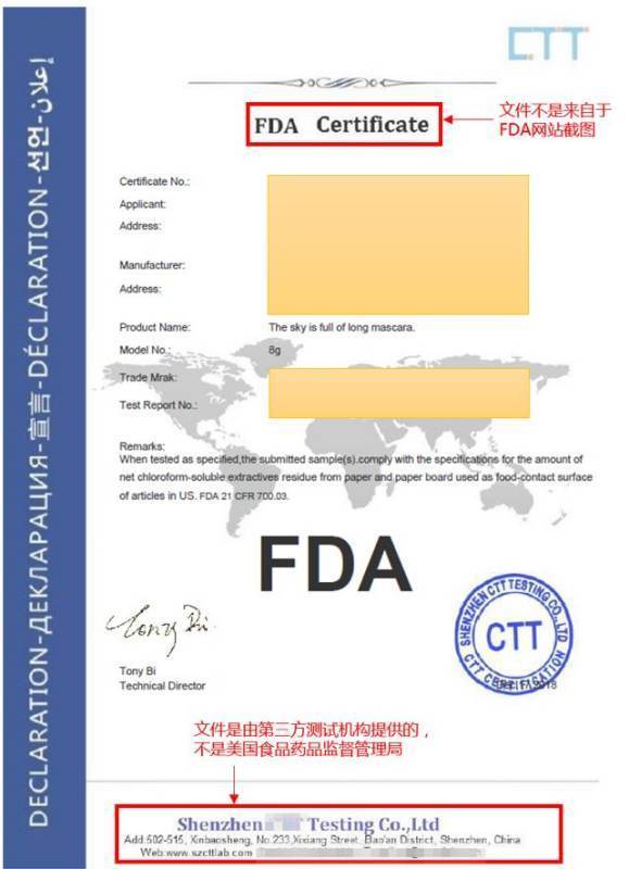 声明屏幕截图上的 FDA 注册证书“有效”或“在售”