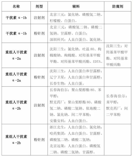 下图是目前国内厂家的干扰素种类及辅料情况;