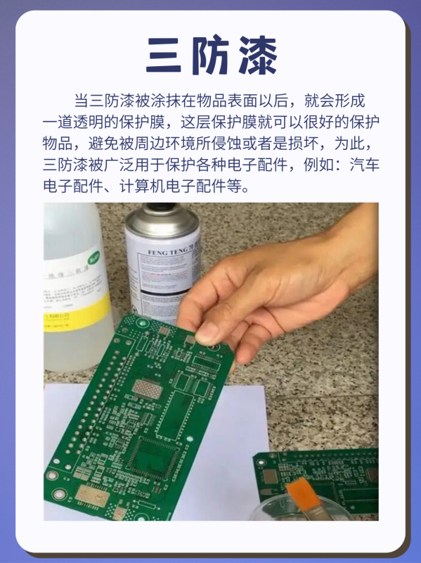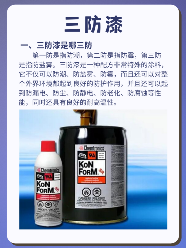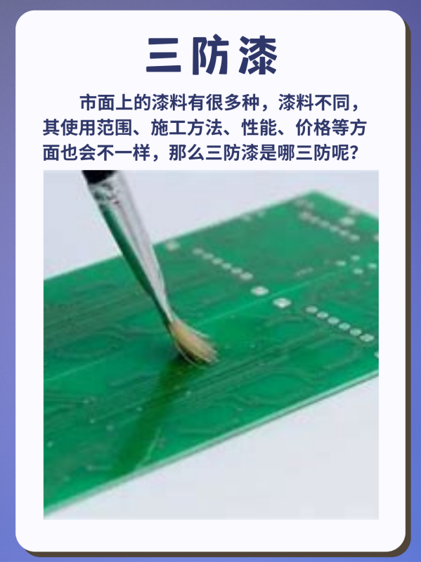 第一防是指防潮,第二防是指防霉,第三防是指防盐雾。三防漆是一种配方非常特殊的涂料,它不仅可以防潮、防盐雾、防霉,而且还可以对整个外界环境都起到良好的防护作用,并且还可以起到防直航银漏电、防尘、防静电、防老化、防腐蚀等性能,同时还具有良好的耐高温性。