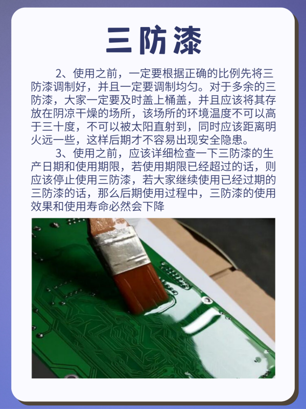 3、使用之前,应该详细检查一下三防漆的生产日期和使用期限,若使用期限已经枝颤超过的话,则应该停止使用三防漆,若大家继续使用已经过期的三防漆的话,那么后期使用过程中,三防漆的使用效果和使用寿命必然会下降。