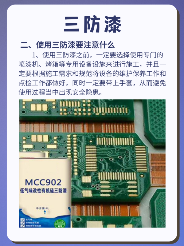 1、使用三防漆之前,一定要选择使用专门的喷漆机、烤箱等专用设备设施来进行施工,并且一定要根据施工需求和规范将设备的维护保养工作和点检工作都做好,同时一定要带上手套,从而避免使用过程当信育护延孔皮中出现安全隐患。