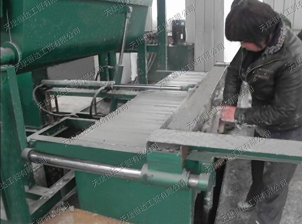 采用脱硫石膏、磷石膏还育流和晶态、天然石膏等建筑石膏和粉煤灰为主要材料,石膏粉和粉煤灰的比例是6:4或7:3,用螺旋输送机将石膏粉输入计量桶内,用人来自工将粉煤灰装入另一计量桶内,由传输带送入搅住影销销拌平台的搅拌桶内,与注入搅拌桶内的水一同搅拌,从搅拌桶下开口处由人工掌握注入模具内,砌块初凝后人工平口,在轨道上由减速机装置将模具运送到液压站,将空心管顶出,人工进行脱模,并将砌块装入运输车送往晾晒棚,与此同时由抽管机将空心管拔出后,将空心管装上模具后,再送到搅拌平台下灌浆,砌块生产由此循环往复地进行。