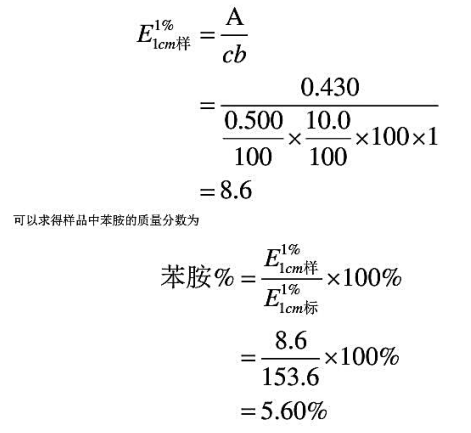 已知苯胺B带的λmax为280nm,ε为1430L•mol-1•cm-1。精密称取含有苯胺的样品0.500g,用无水乙醇溶解配制成100mL溶液,精密量取10.0mL,用相同溶剂稀释至100mL,用1cm的比色皿测得280nm处的A为0.430。求样品中苯胺的质量分数。已知苯胺摩尔质量为93.128。请帮忙给出正确答案和分析,谢谢!