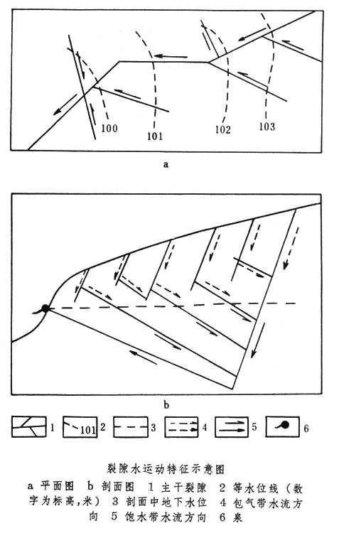 在裂隙岩体中开采或排除地下水时,要根据裂隙水的特点布置佑孔与坑道。在裂隙岩体中修建水利工程时,要充分考虑裂隙水的复杂性。渗漏计算,排水孔 (幕)和灌浆工程的设计,都应充分考虑裂隙岩体渗透性的不均一性,各向异性和尺度效应。