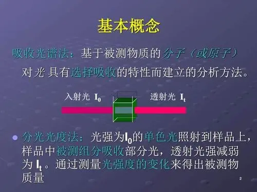 其原理是基于被测物质溶液的颜色或加入显色剂后生成的有色溶液的颜色,颜色深度和物质含量成正比,则根据光被有色溶液吸收的强度,即可测定溶液中物质的含量。