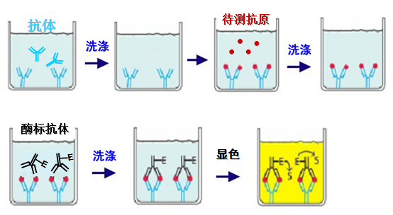 用洗涤的方法使固相载体上形成的抗原抗体复合物与其他物质分开,最后结合在固相载体上的酶量与标本中受检物质的量成一定的比例。
