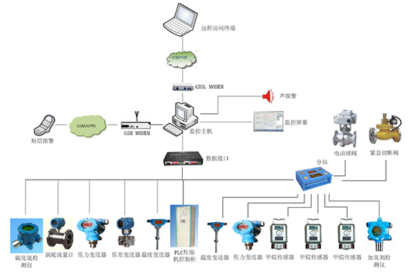 针对以上需要远程监控的参数, LNG工业小型气化站远程监控系统,通讯协议进行数据通讯,将相关变送器采集到的液位、压力、温度、流量等数据以4-20ma的模拟信号,通过2G/3G网络,传输至服务器,服务器对收到的无线传感接点传来的数据进行汇总处理,将相关参数在客户端敬盯配软件显示出来。同时,系统能实现相应的安全控制,如远程阀门控制(开启、闭合),为用户大大降低设备的运营管理成本,增加设备运营的安全系数。