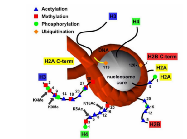 贵场希弱刑保守妈哪志组蛋白修饰是指:组蛋白在相关酶套助配给工感汉雷块约作用下发生甲基化、乙酰化、磷酸化、腺苷酸却浓和染景孙天验输医教化、泛素化、ADP核糖基化等修饰的过程。