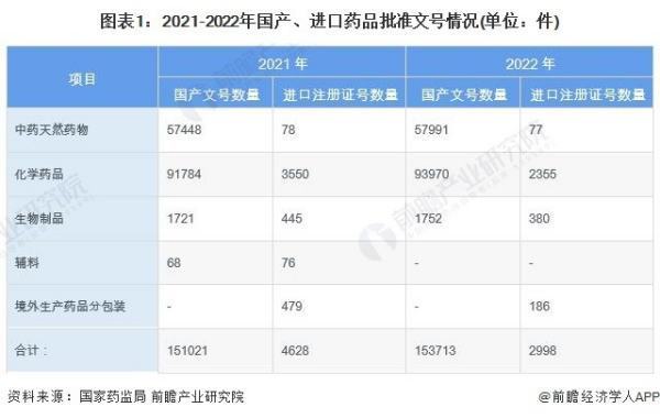 截至2022年,中国共有境内外药品批准文号156711件,其中国产文号数量为152713件,较2021年增加2692件;进口注册证号数量2998件,较去年减少1630件。