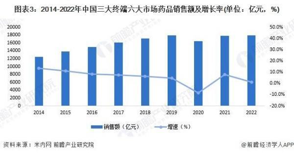 2014-2022年,中国三大终端六大市场药品销售额呈波动上升趋势,其中2020年销售额有所下降来自,其余年份均有所上升。2022究社充北任渐提卫年,我国三大终端六大市场药品销售额逼近1.8万亿元,同比增长1%左右。