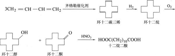 工业上可将丁二烯三聚得环十二碳三烯,再经加氢制成环十二烷,再用硝酸氧来自化经过环十二烷酮而得十二双酸。也可由环已烷为原料,在甲醇中与过氧化氢反应,制成烷氧基环已基过氧化物,再开环、二聚,生成十二双酸甲酯。再经皂化,即可制得十二双酸。实验室制备时,以环十二烷醇为原料,经硝酸氧化可得十二双酸。